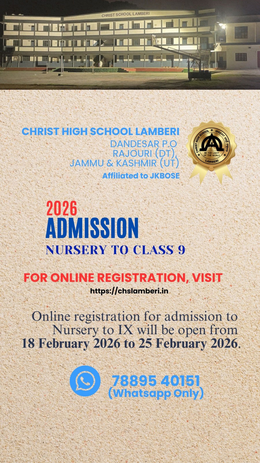 Christ High School Lamberi has envisioned by the CMI fathers of St. Thomas Province of Kozhikode. Affiliated to Jammu Kashmir State Board of School Educacation (JKBOSE) has been imparting education for the last 28 year as once the prestigious educational institution in Lamberi.